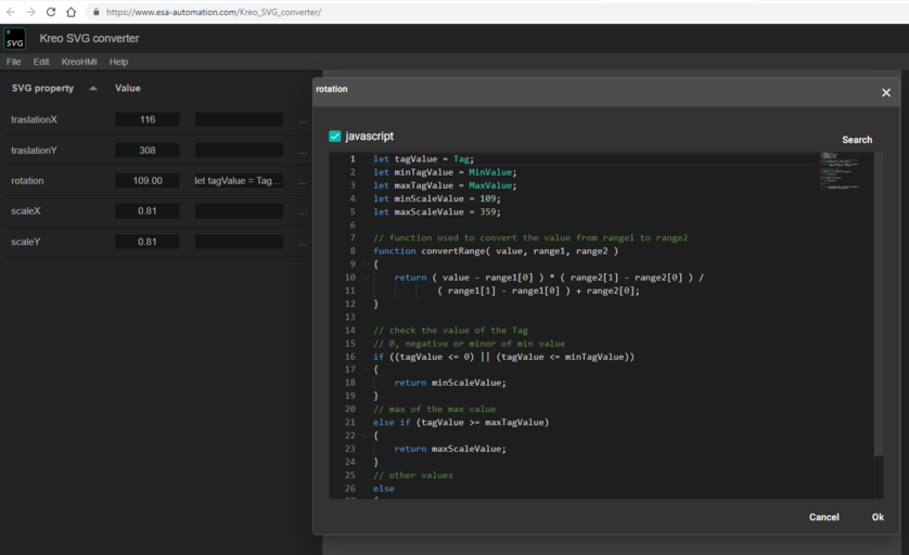 In case the movement is not a simple traslation or rotation the user has the possibility of associate a Javascript code to the object property.