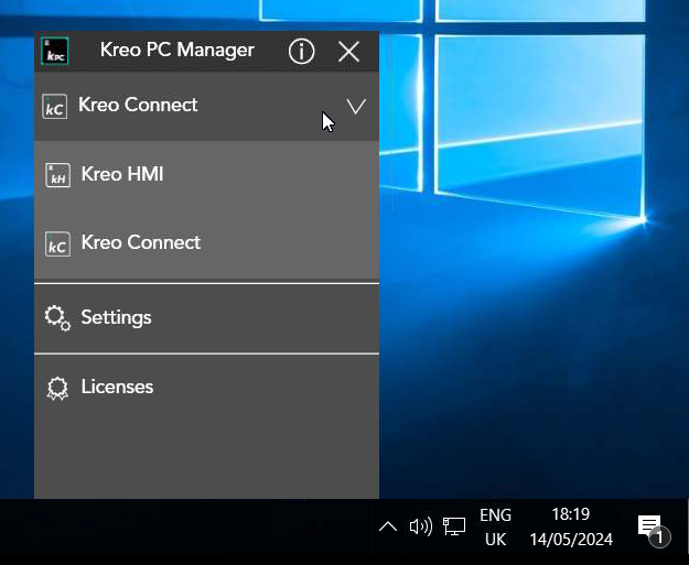 La prima selezione consente all'utente di passare da Kreo Connect al runtime Kreo HMI e viceversa