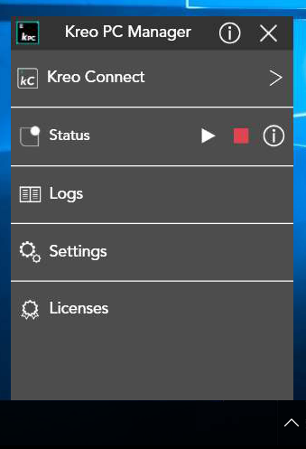 Una volta installato e avviato facendo doppio clic sull'icona del desktop (la prima volta il runtime deve essere avviato manualmente), una piccola icona di Kreo PC Manager verrà aggiunta alla barra delle applicazioni.