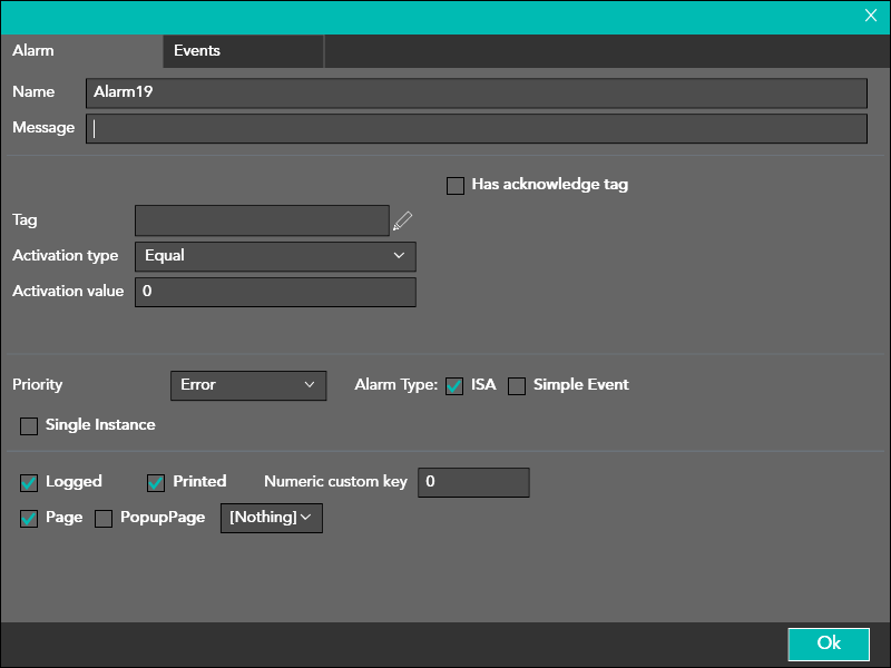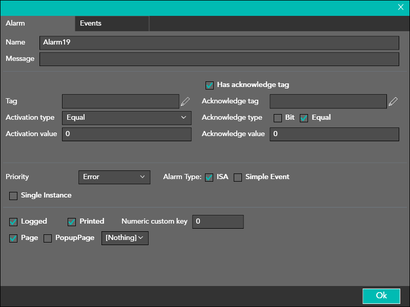 It allows to manage the acknowledgment of the alarm through PLC tags both bitwise (in case the alarm is programmed on the value of the single bit of a tag) and value.