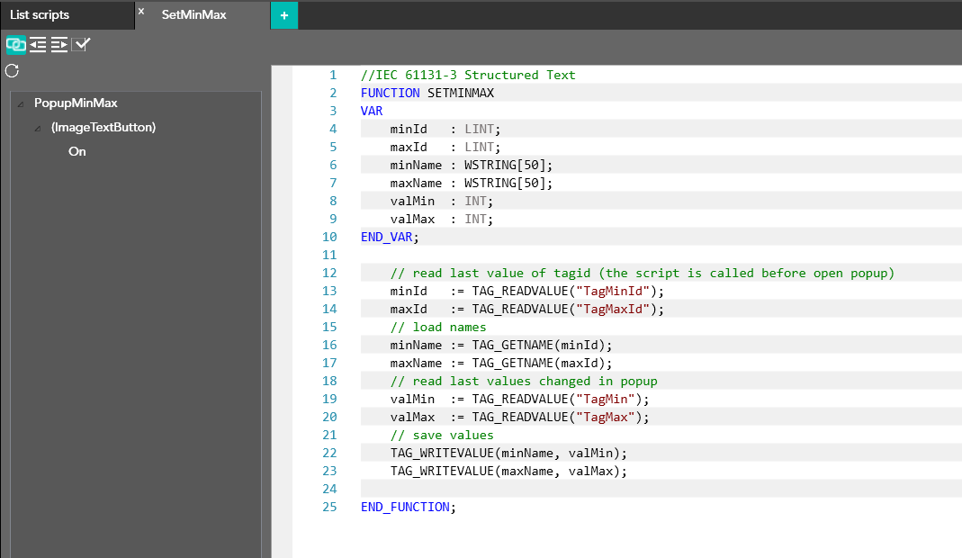 For example the script in the image is fired via the On event of a TextButton inside the pop_up window named PopupMinMax