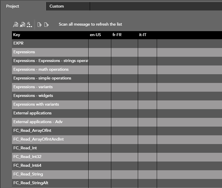In this tab the user can insert the translations of the various texts of the project corresponding to the different languages.
