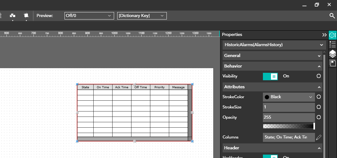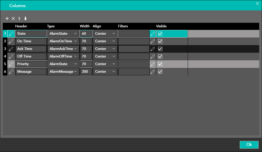 The alarm log view displays the different states of all the alarms that have been selected to be saved in the log.