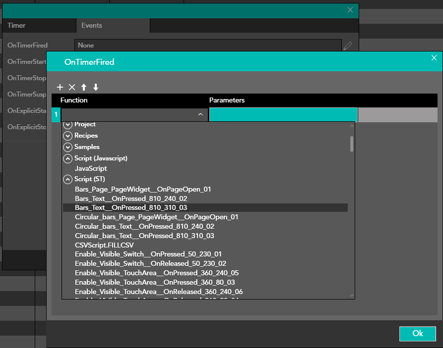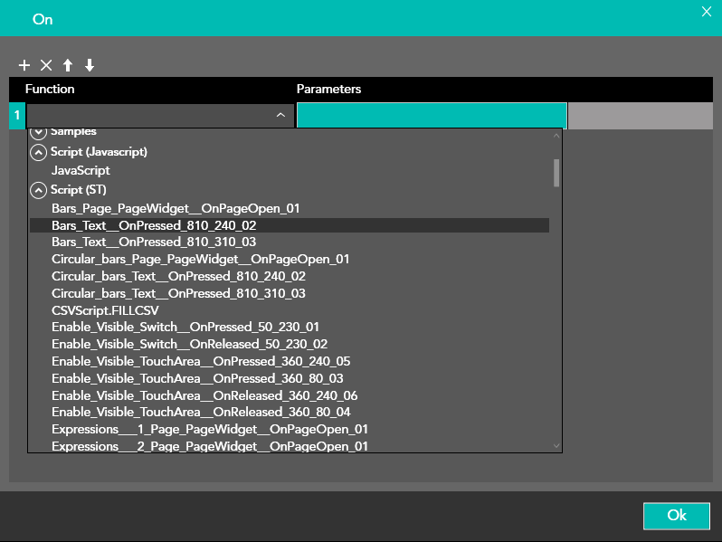 In the On event of the button it is necessary to select the script to be executed which is located in the Javascript or ST script section.