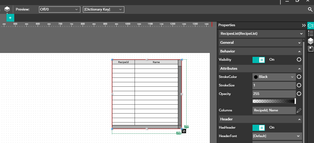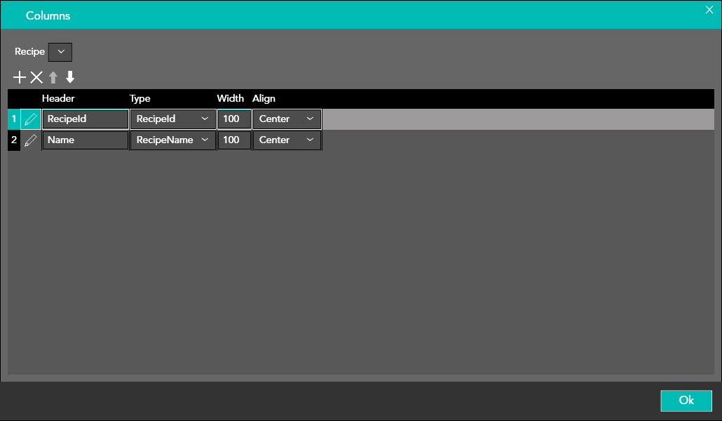 The columns property allows you to select which is the Recipes structure that must be associated with the view and the data that must be presented in the various columns of the grid itself.