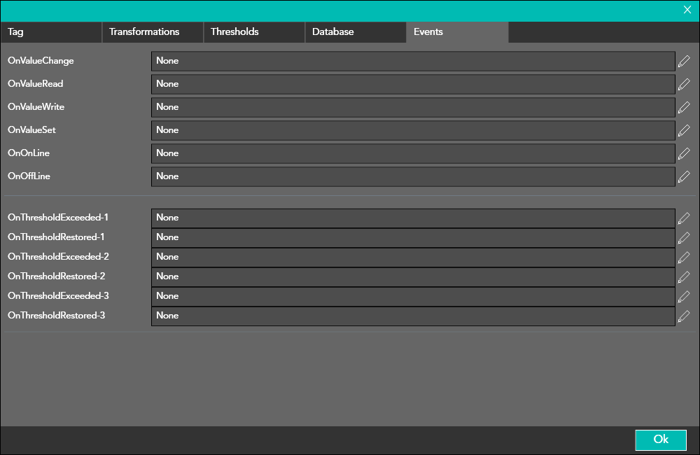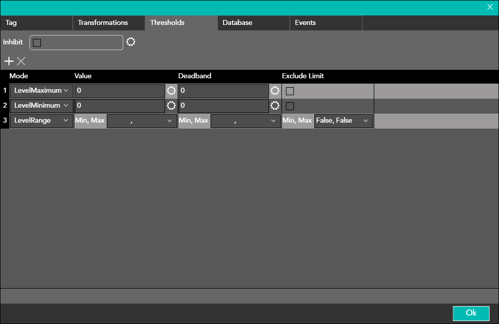Through this window the user can enable both the threshold values to be applied to the tag and the values that define an interval.